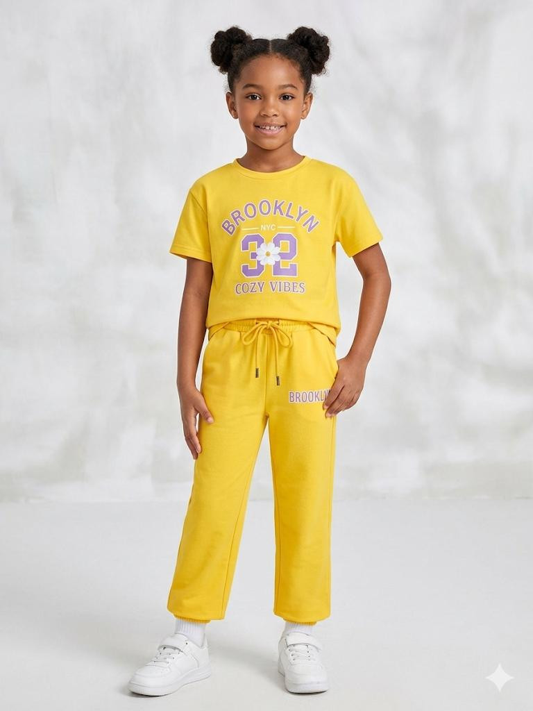 - Style: Two-piece "Co-ord" set featuring a graphic t-shirt and matching jogger pants.