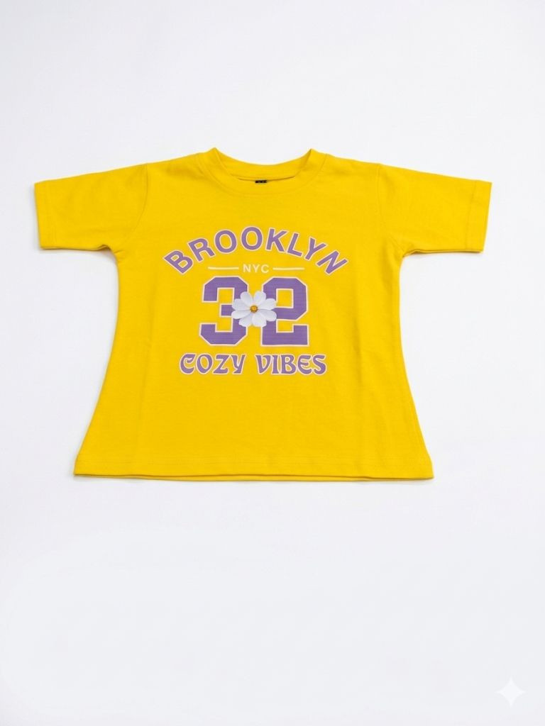 - Key Details: * Top: Crew neck, short sleeves, "Brooklyn 32" graphic with floral accents and "Cozy Vibes" text.