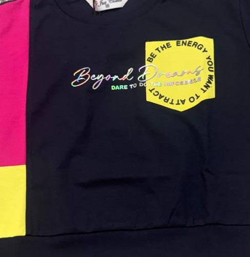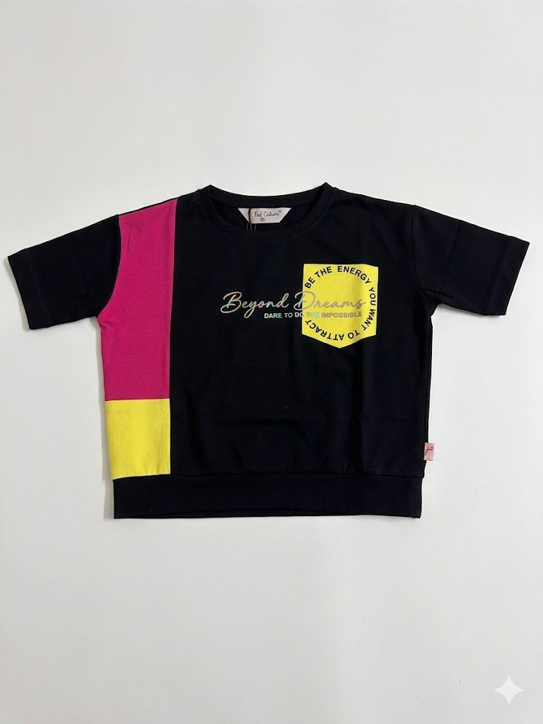 - Top: A navy blue, short-sleeved crew neck t-shirt. It features a striking vertical color-block panel on the right side in neon pink and lime green. A matching lime green graphic "pocket" print on the chest adds a modern, asymmetrical touch.