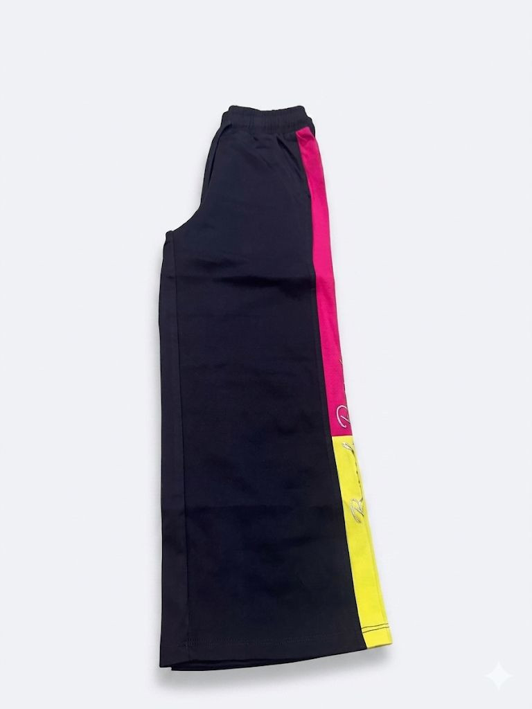 - Bottoms: Matching navy blue wide-leg track pants. The design mirrors the top with bold neon pink and lime green side stripes, creating a cohesive, elongated silhouette. The elasticated waistband with a functional drawstring ensures a comfortable, adjustable fit.
