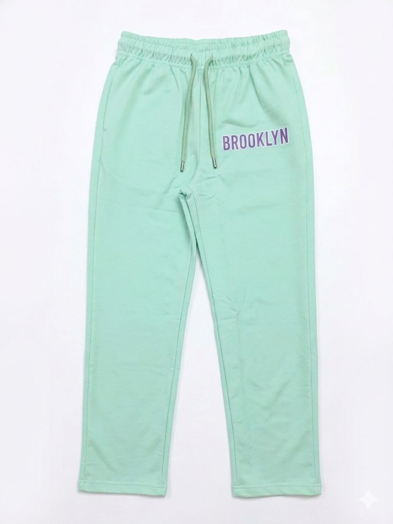 - Bottoms: Matching wide-leg joggers or track pants. They feature an elastic waistband with a functional drawstring and a vertical purple "BROOKLYN" graphic running down the left leg, mirroring the font on the shirt.