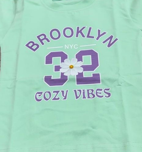 - Top: A short-sleeved t-shirt featuring a purple graphic print. The design includes the word "BROOKLYN" in an arch, the number "32" with a small daisy in the center, and the phrase "COZY VIBES" underneath.