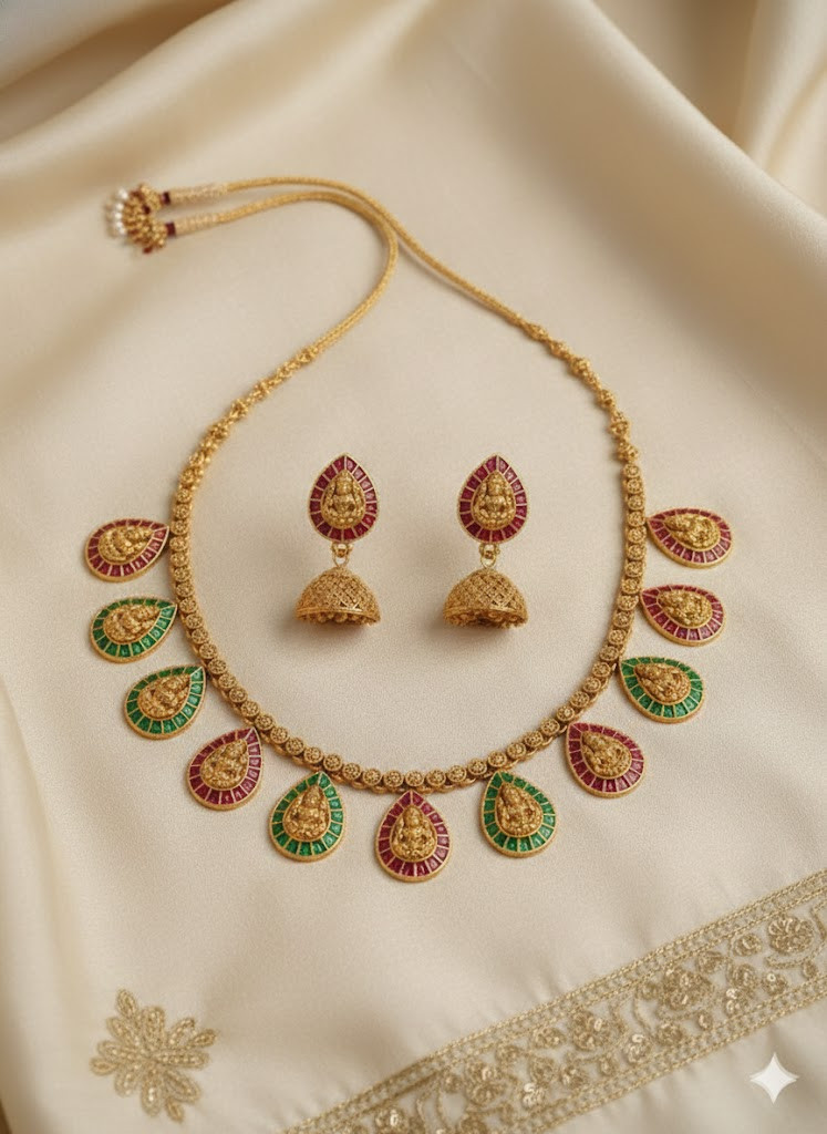 - Pendants: The necklace features multiple Mango (Kaisa) motifs or "Teardrop" charms suspended along the chain.